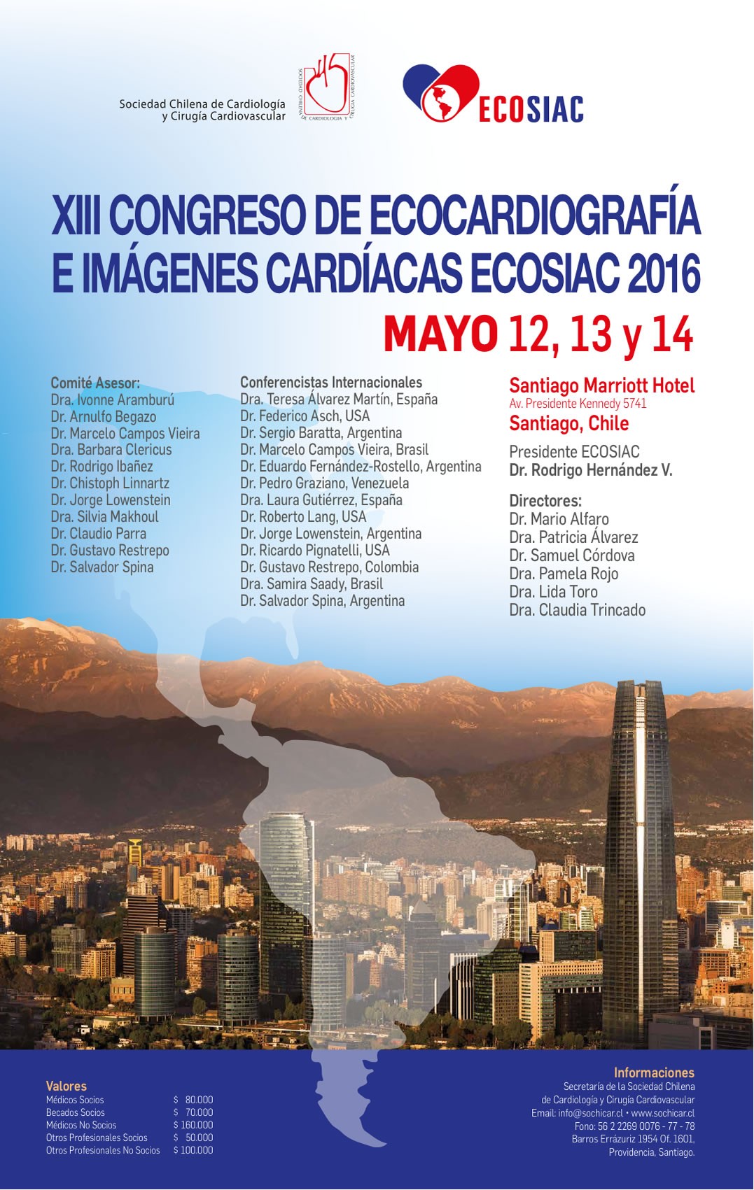 Los días 12, 13 y 14 de mayo se desarrollará el XII Congreso de Ecocardiografía e Imágenes Cardiacas ECOSIAC 2016, en el Centro de Convenciones Hotel Marriot, en Santiago.