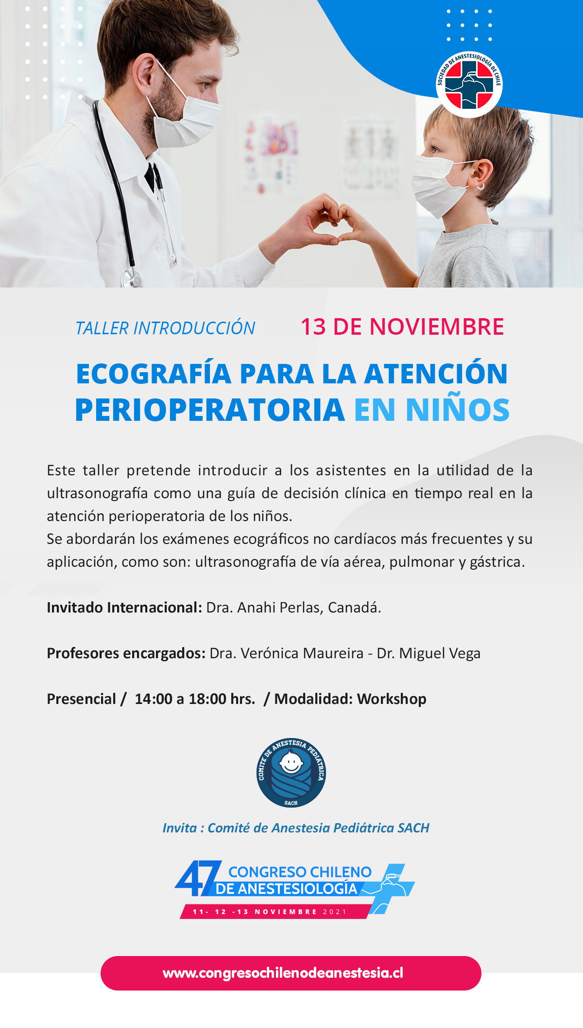 Este taller, con un aforo total de 24 participantes, se propone introducir a los asistentes en la utilidad de la ultrasonografía como una guía de decisión clínica en tiempo real en la atención perioperatoria de los niños. Se abordarán los exámenes ecográficos no cardíacos más frecuentes y su aplicación, como son: ultrasonografía de vía aérea, pulmonar y gástrica.