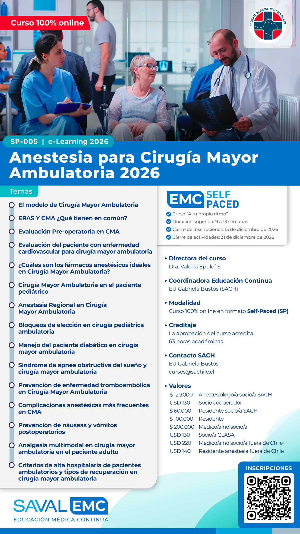 SACH, a través de su Sistema de Educación Continua (SEC), ha preparado una nueva oportunidad de actualización y capacitación online: Curso de Anestesia para Cirugía Mayor Ambulatoria (CMA), dirigido a especialistas en anestesiología y residentes.