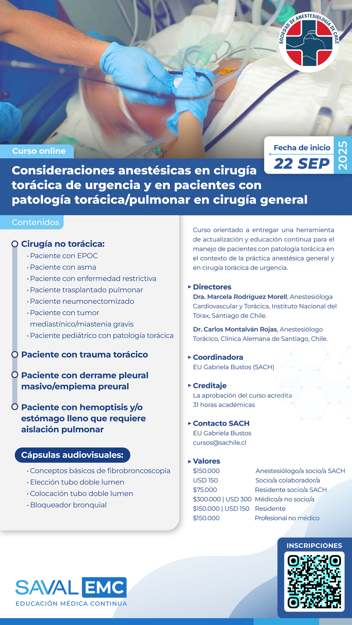 El Comité de Anestesia Cardiovascular y Torácica de SACH, con la coordinación de la Secretaría de Educación Continua (SEC), anuncia el inicio el 22 de septiembre 2025 del curso e-learning “Consideraciones anestésicas en cirugía torácica de urgencia y en pacientes con patología torácica/pulmonar en cirugía general”. Está diseñado para entregar una herramienta de actualización y educación continua.