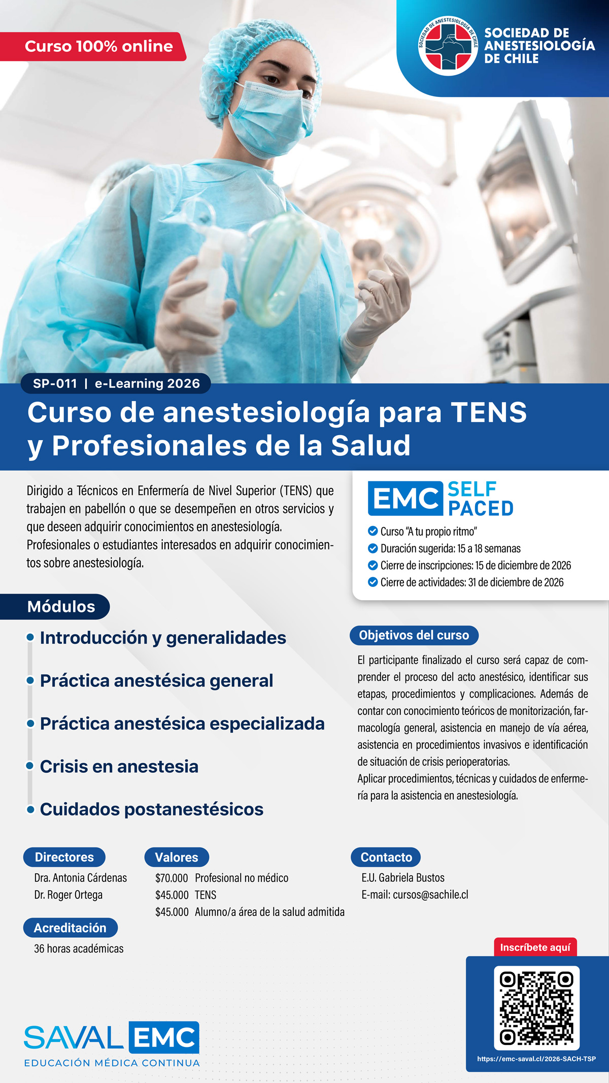 SACH invita a inscribirse en el Curso de Anestesiología para TENS y Profesionales de la Salud 2026, especialmente diseñado para colaboradores que trabajan en pabellón u otros servicios y que deseen adquirir conocimientos en anestesiología. El curso también está abierto a profesionales y estudiantes interesados.