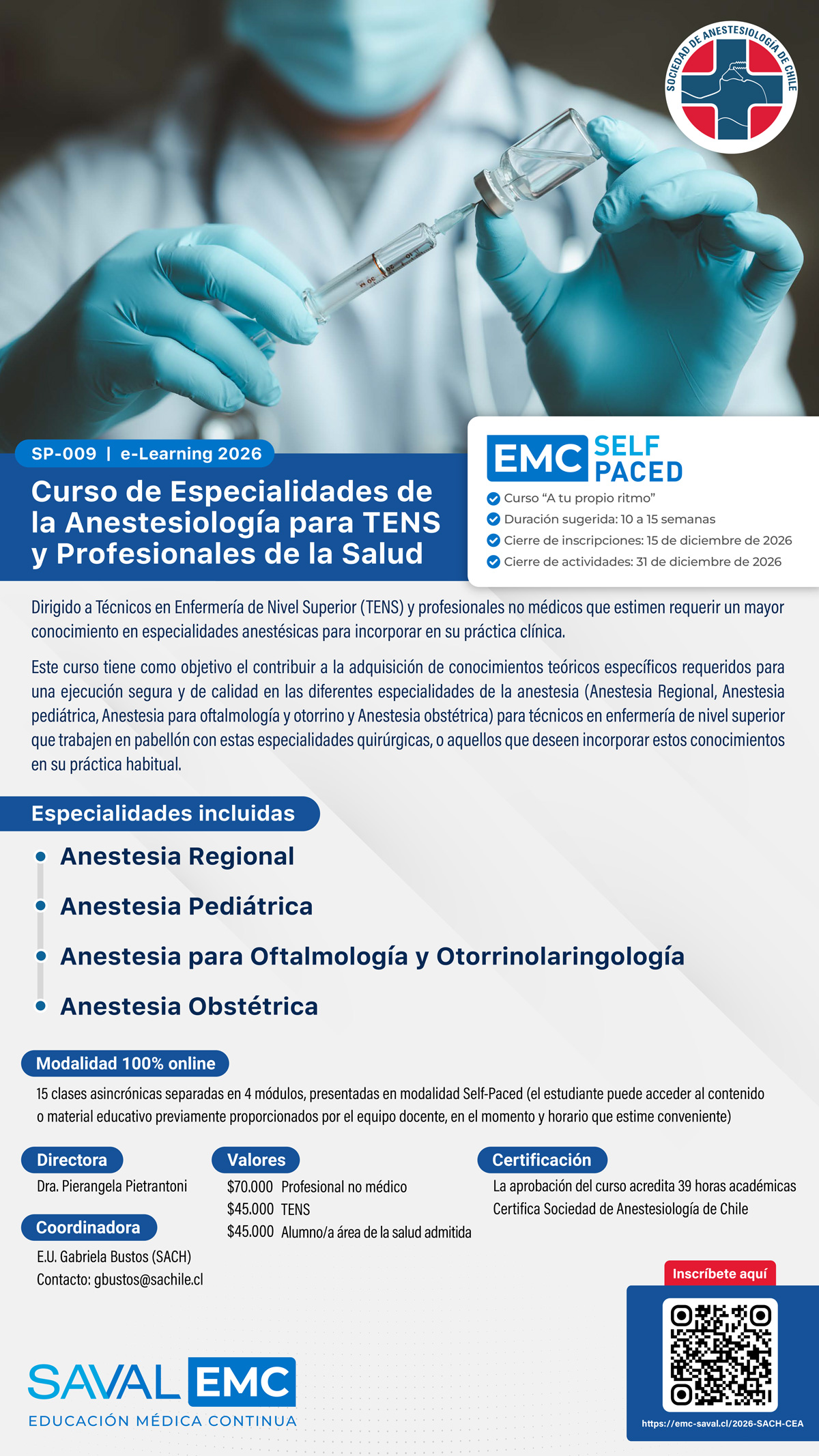 Atención: Ya se encuentran abiertas las inscripciones para el Curso de Especialidades de la Anestesiología para Técnicos en Enfermería de Nivel Superior (TENS) y otros Profesionales de la Salud, organizado por la Secretaría de Educación Continua de la Sociedad Chilena de Anestesiología (SACH).