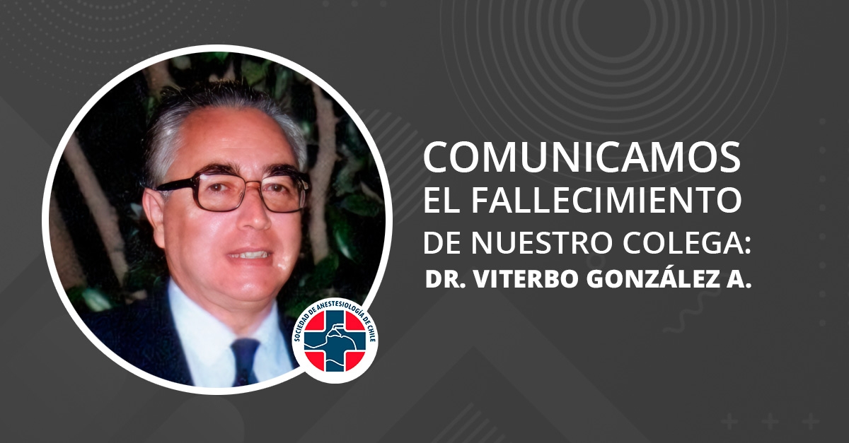 La Sociedad de Anestesiología de Chile expresa su profundo pesar por el fallecimiento del Dr. Viterbo González Alcalde, (QEPD) destacado anestesiólogo y académico del Departamento de Anestesiología de la Escuela de Medicina de la Pontificia Universidad Católica de Chile.