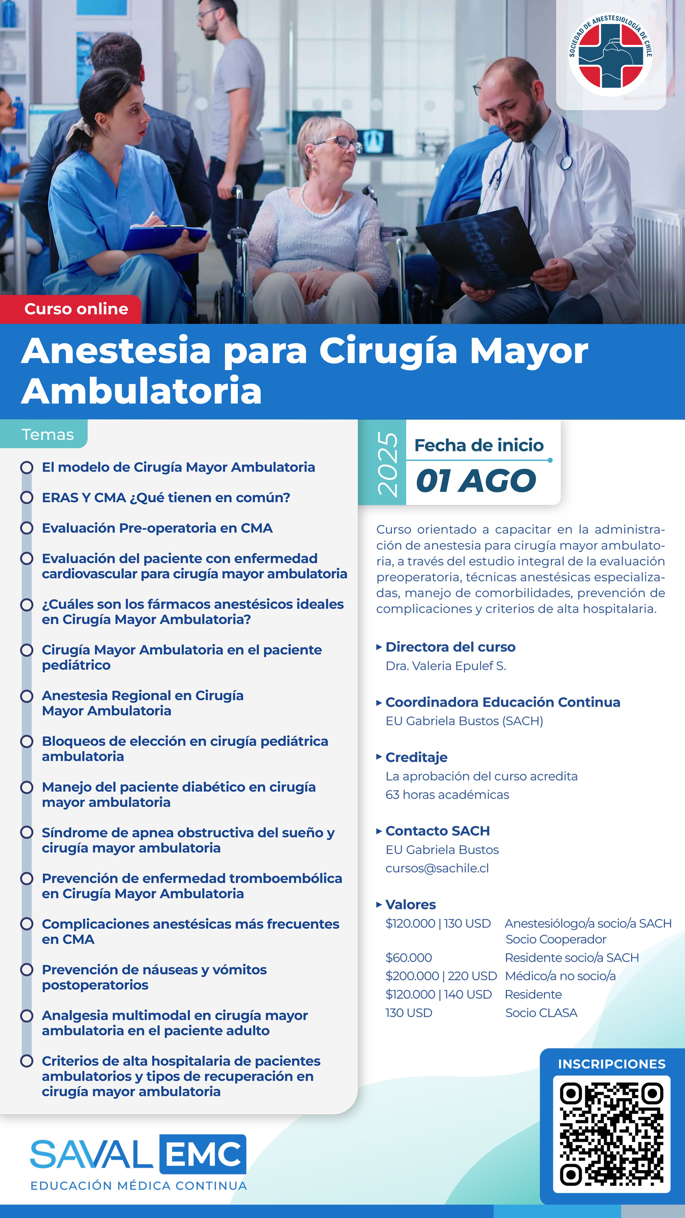 SACH, a través de su Sistema de Educación Continua (SEC), ha preparado una nueva oportunidad de actualización y capacitación online: Curso de Anestesia para Cirugía Mayor Ambulatoria (CMA), dirigido a especialistas en anestesiología y residentes.