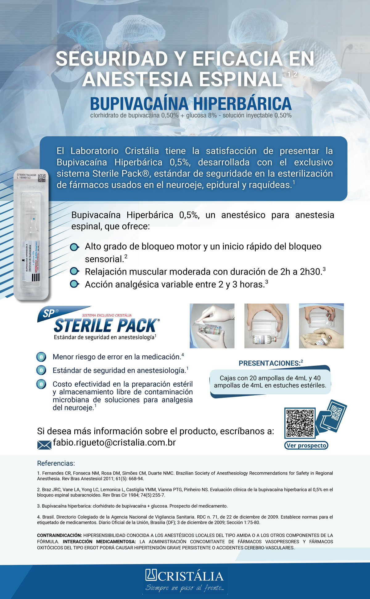 Laboratorio Cristália informa a los anestesiólogos la disponibilidad de Bupivacaína Hiperbárica 0,5%, elaborada con el sistema exclusivo Sterile Pack®, que garantiza un alto estándar de seguridad en la esterilización de fármacos destinados a técnicas neuroaxiales, como anestesia epidural y raquídea.