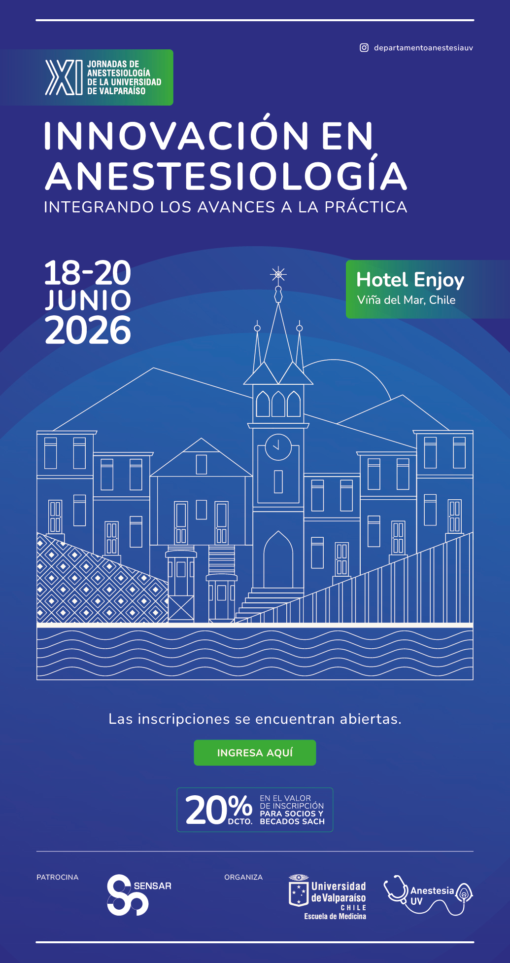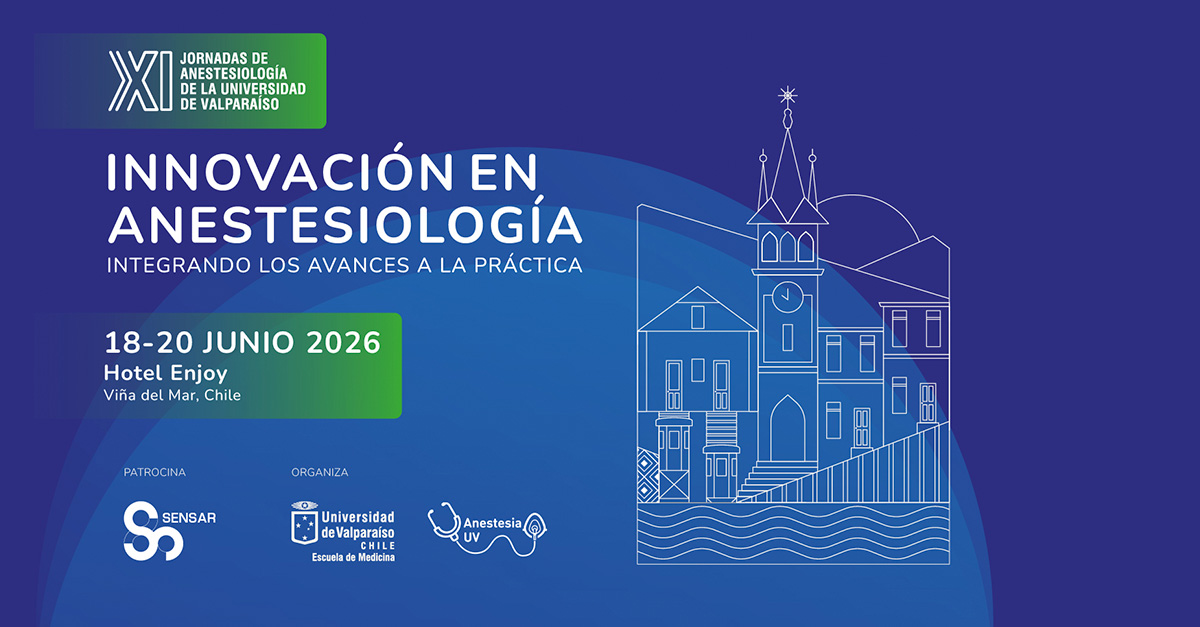 La Cátedra de Anestesiología de la Universidad de Valparaíso invita, a través de SACH, a participar en las XI Jornadas de Anestesiología “Innovación en Anestesiología: integrando los avances a la práctica”. Se realizarán en modalidad presencial los días 18, 19 y 20 de junio de 2026, en el Hotel Enjoy de Viña del Mar, Chile.